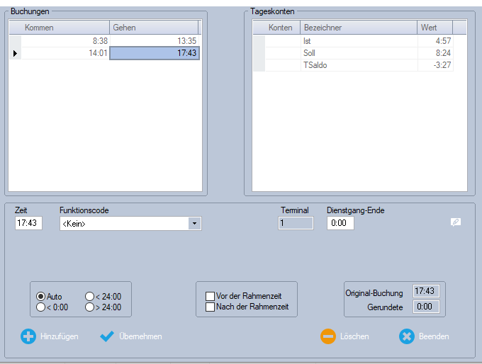 Im Anhang der Screenshot mit der Übersicht der 4 Buchungen und unten rechts Orignal-Buchung 17:43 / gerundete 0:00.